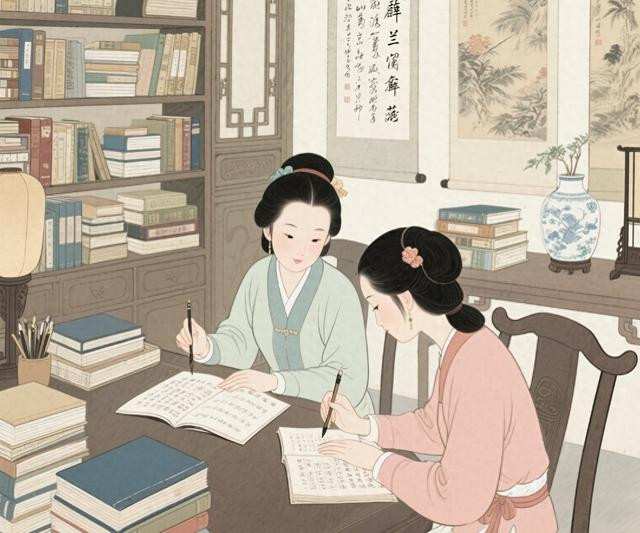 "姐姐,你看这'月上柳梢头,人约黄昏后',写得多么美妙。"兰英放下书卷,眼中闪烁着向往的光芒。